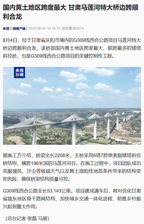 • 甘肅工程咨詢集團監理項目取得重大突破:國內黃土地區跨度最大 甘肅馬蓮河特大橋邊跨順利合龍